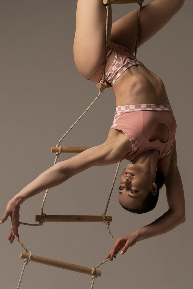 Make their hearts race in these high waisted, high leg shorts with a cut out waistband and sexy hip strap details. Created in this angelic baby pink checked fabric.