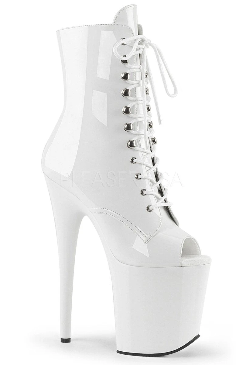 - Patent whiteΒ Platform Lace-Up Front Ankle Peep toe Boot, Inside Zip Closure
