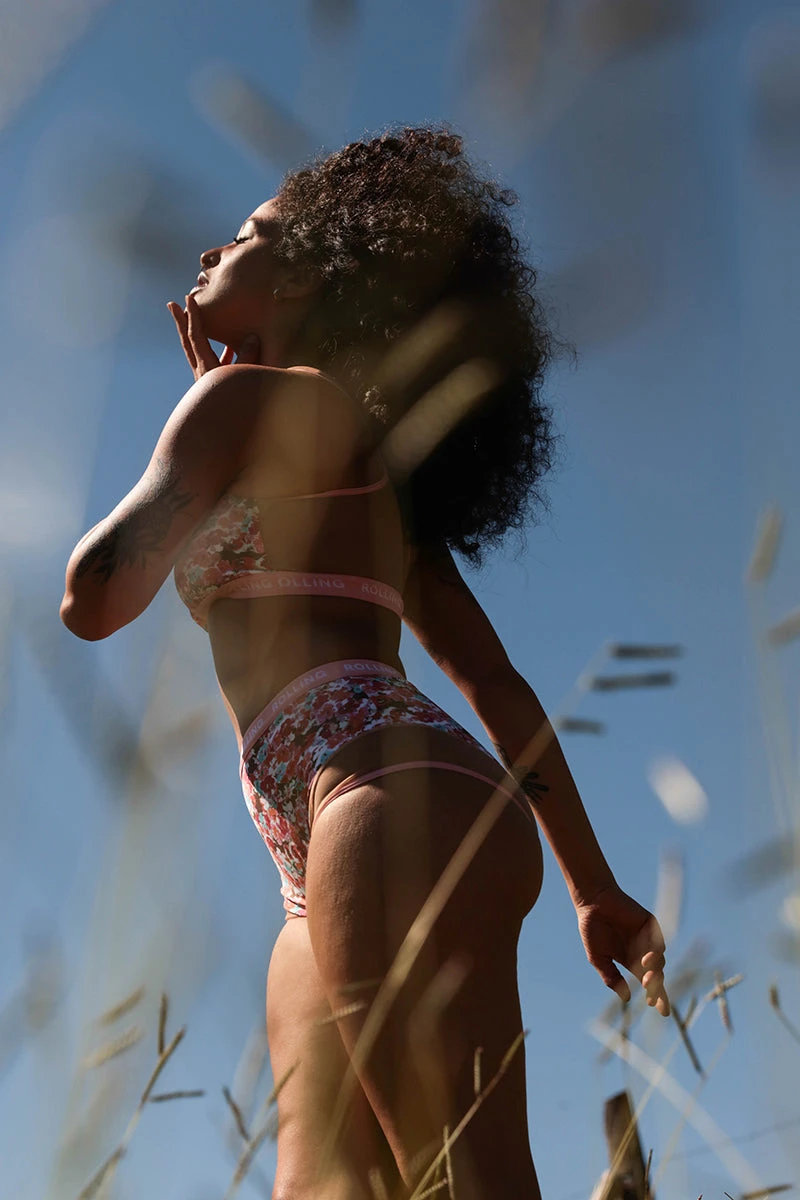 Rolling’s signature Alpha sets are now available in summery florals! This scoop neck racer back top features a full mesh back and logo underbust band.